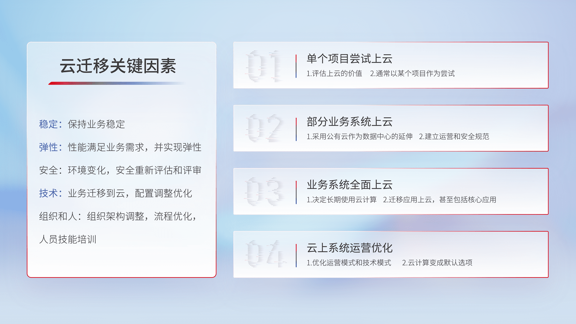 结合实际业务,,从规划设计、、云平台选型、、、、云原生改造、、、、数据迁移、、集成交付,,,迁移全过程为客户识别最佳上云路径,,做好风险识别管理,,设计网络架构、、身份权限、、安全审计合规、、、操作审计、、、、日志审计、、、监控告警策略、、、多站点容灾设计等,,,对云上基础设施进行整体规划,,,提升IT治理水平,,,,以满足弹性、、高可用、、、高性能的需求。。