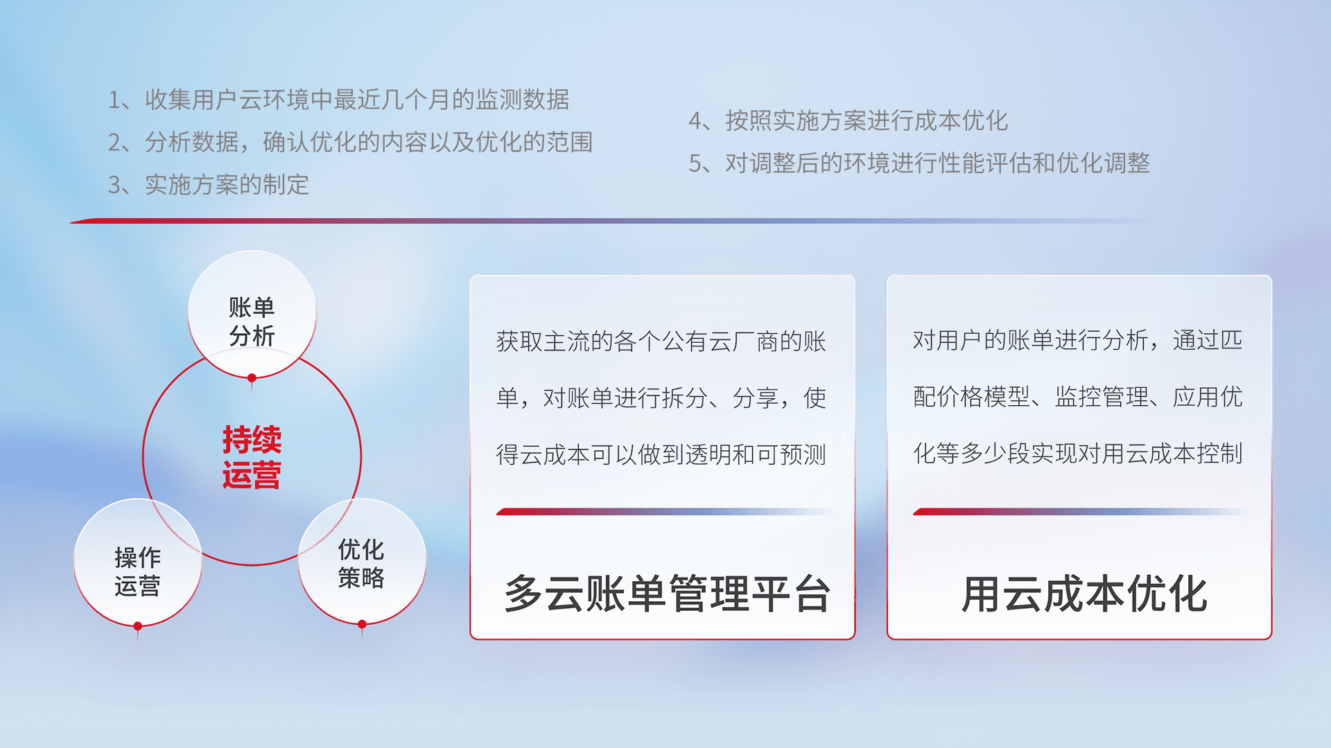 通过多云纳管,,,,以统一的资源数据模型把客户的云资源进行抽象和封装,,进而实现对多云资源的统一操作,,保障云资源管理的可靠性、、稳定性与可用性。。量身定制化运维内容,,,,配置、、开发运维、、补丁管理、、、、备份、、、、监控、、认证和访问管理、、、、审计和日常巡检等,,,保障在用云过程中的可靠度,,,,稳定度以及高可用率。。。